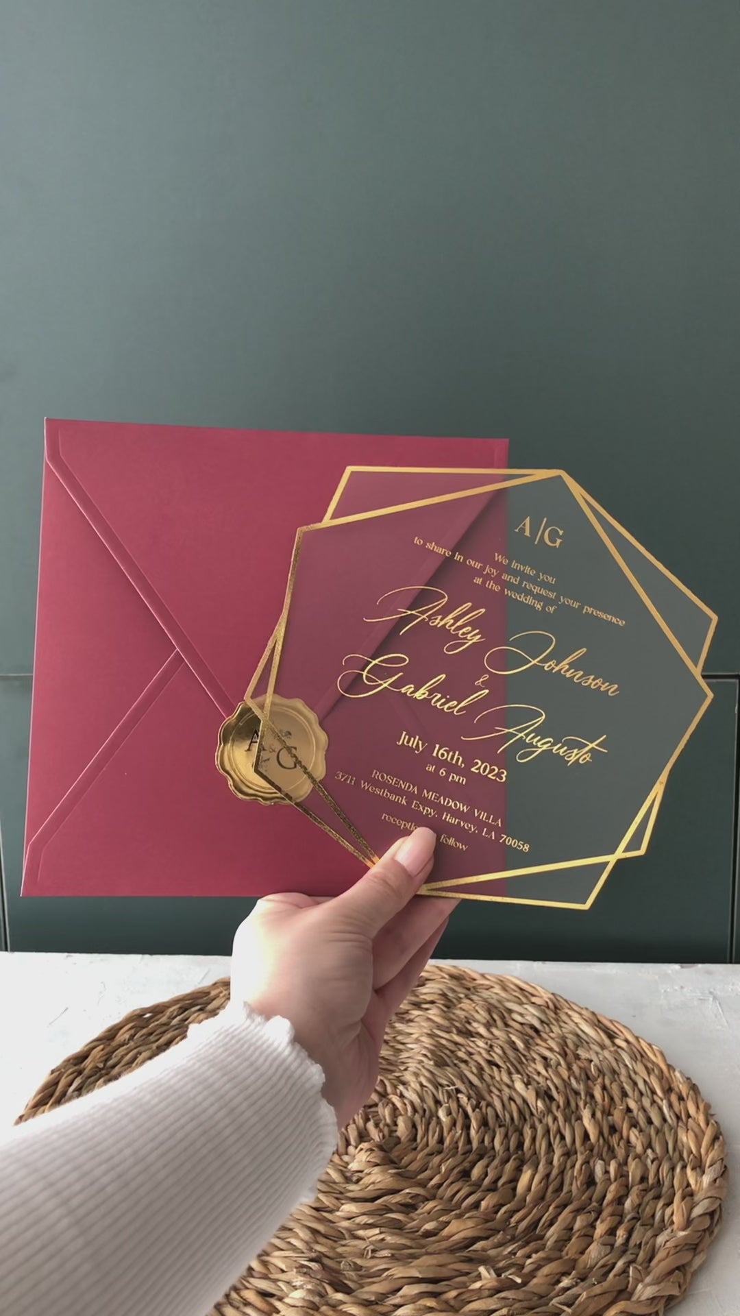 أضف لمسةً مميزةً إلى دعوات زفافك مع دعواتنا الأكريليكية بلون بورجوندي، والمُزينة بطباعةٍ رائعةٍ على ورق الذهب. اترك انطباعًا لا يُنسى لدى ضيوفك مع هذا المزيج من الأناقة والحداثة، مُضفيًا لمسةً مميزةً على يومك المميز.