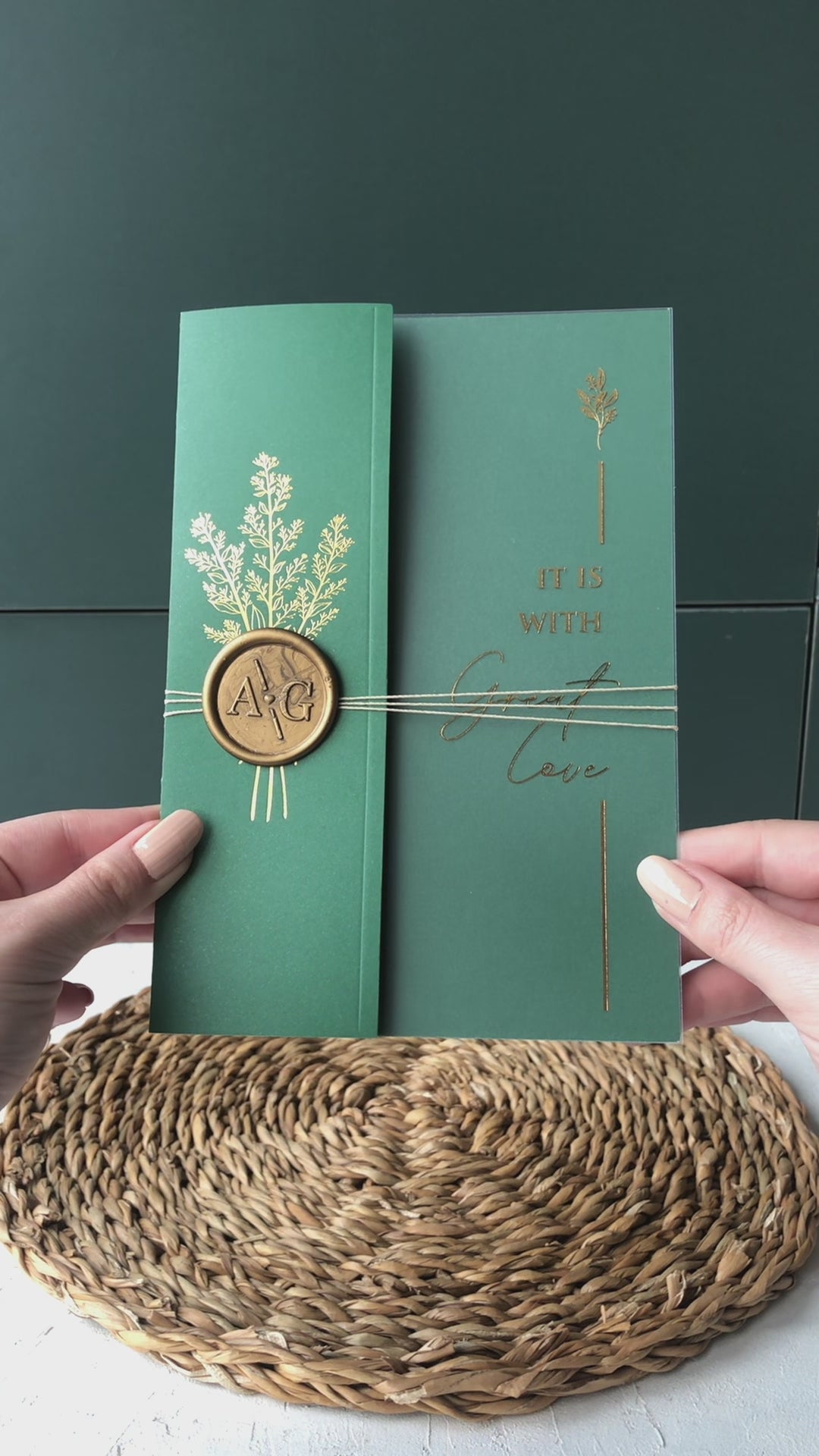 استمتعوا بفخامة دعوات زفافنا المصنوعة من الأكريليك والمطلية بورق الذهب، والمُكملة ببراعة بأظرف نصفية خضراء زمردية وتفاصيل إكسسوارات رائعة بختم الشمع. تُضفي هذه الدعوات لمسة من الرقي الخالد، وهي مثالية للأزواج الذين يبحثون عن طريقة لا تُنسى لدعوة ضيوفهم.
