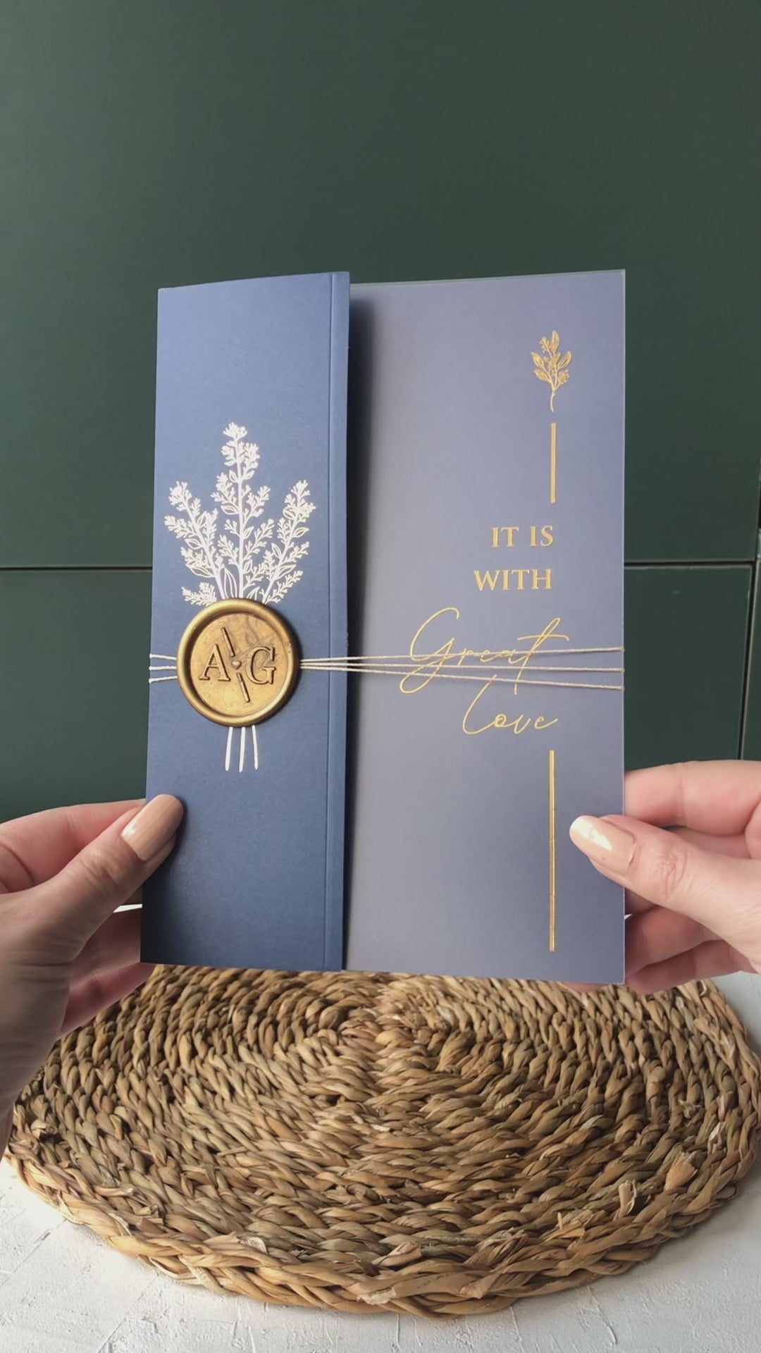 استمتعوا بفخامة دعوات زفافنا المصنوعة من الأكريليك المطلية بورق الذهب، والمُزينة بشكل رائع بأظرف زرقاء داكنة بنصف غلاف، وتفاصيل إكسسوارات رائعة بختم الشمع. تُضفي هذه الدعوات لمسة من الرقي الخالد، وهي مثالية للأزواج الذين يبحثون عن طريقة لا تُنسى لدعوة ضيوفهم.