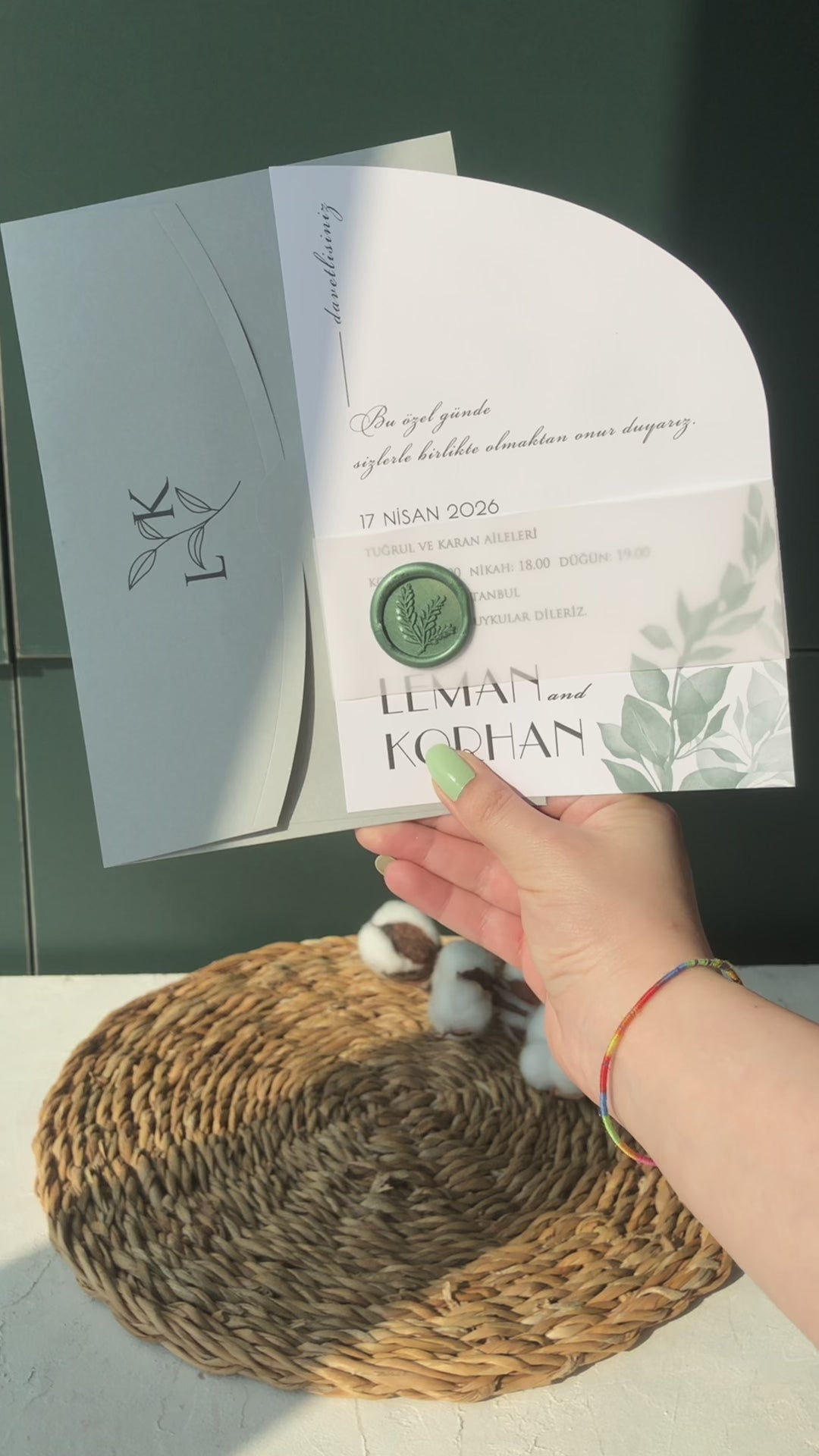 دعوة زفاف نصف قوس مع تفاصيل أوراق خضراء
