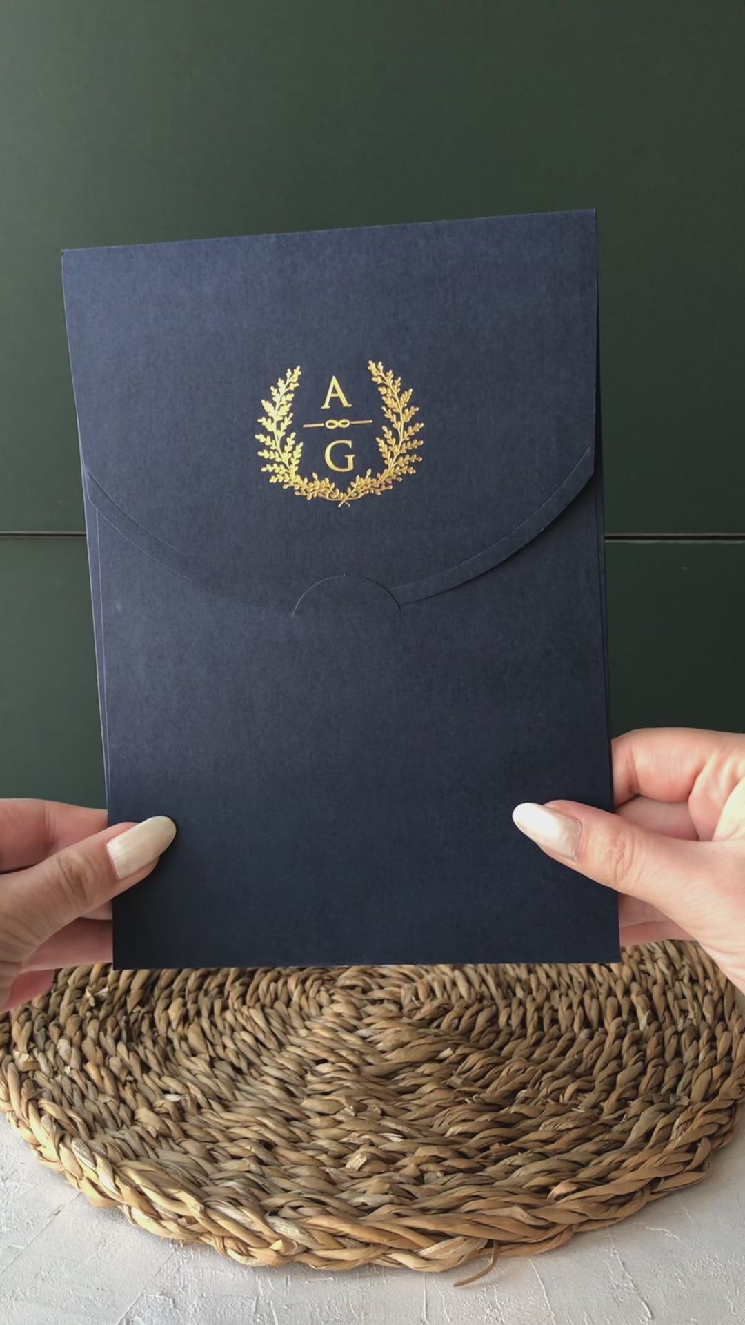 دعوة زفاف أكريليك عصرية بتصميم قوسي مع ظرف أزرق. اجذبي انتباه ضيوفك بدعوة عصرية وأنيقة. يُضفي الظرف الأزرق لمسة مميزة على دعوة الزفاف الأكريليكية هذه، مما سيجعلها مميزة بين غيرها.