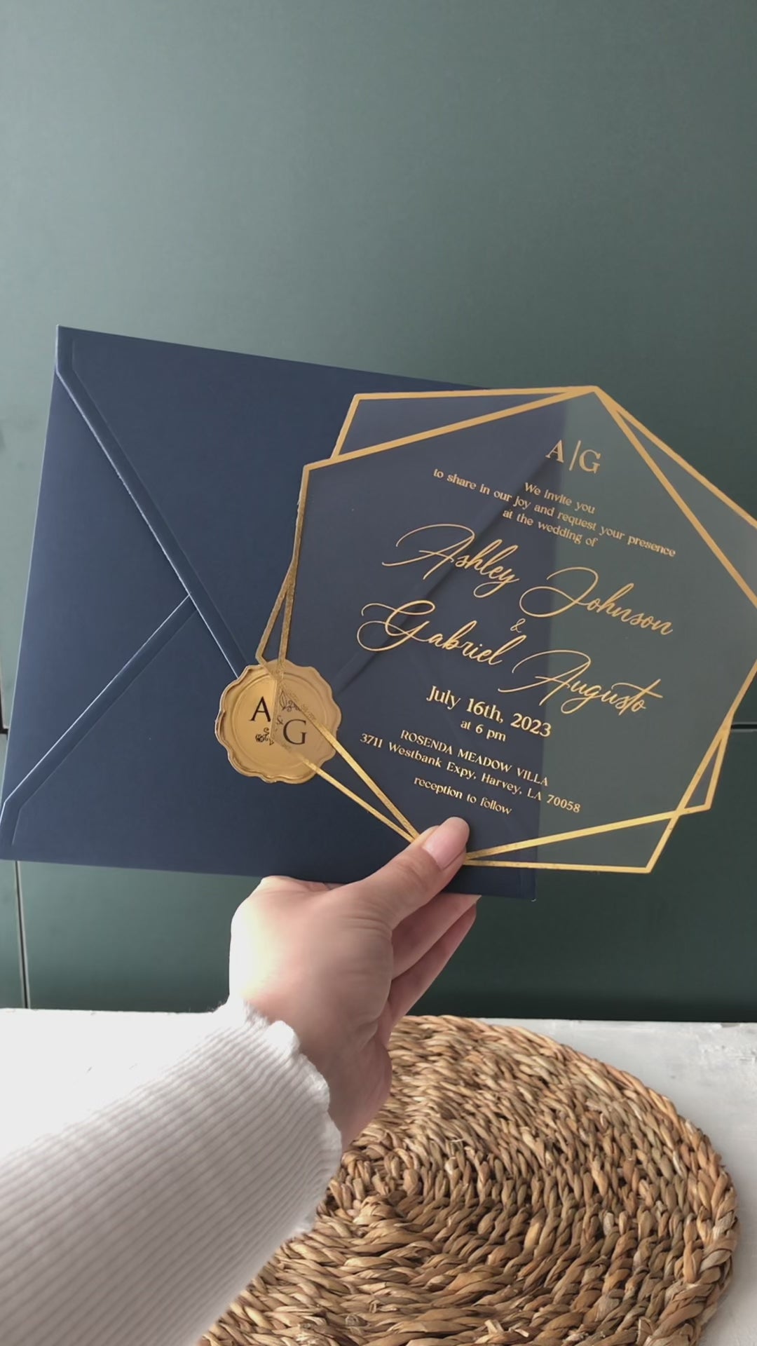 أضف لمسةً مميزةً إلى دعوات زفافك مع بطاقات الأكريليك الزرقاء الداكنة، المطبوعة بورق ذهبي أنيق. مصنوعة من مواد عالية الجودة، ستُبهر ضيوفك بالتأكيد وتُضفي لمسةً مميزةً على يومك المميز. تألق بمزيجٍ مثالي من الرقي والحداثة.