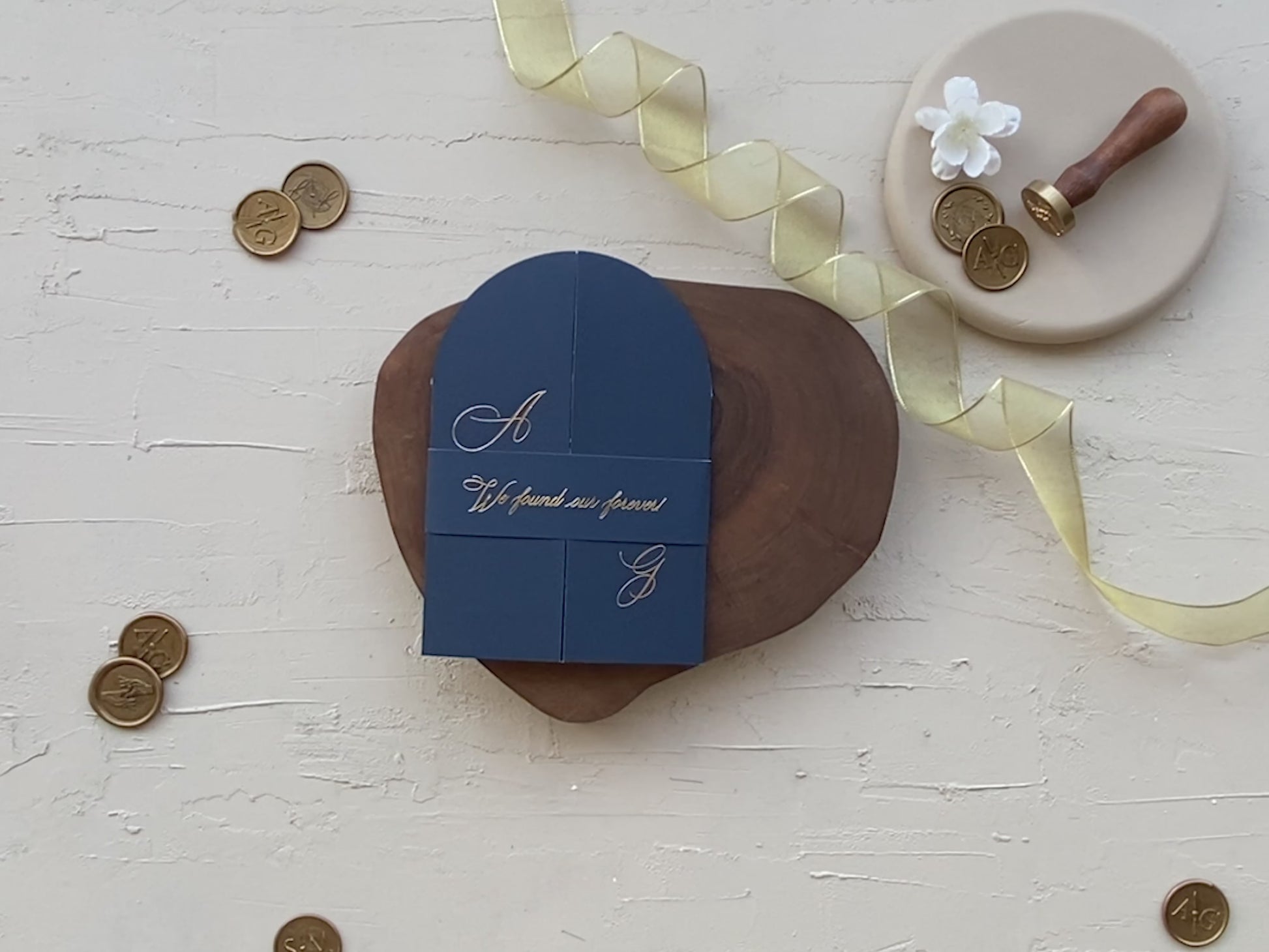 دعوة زفاف مطوية باللون الأزرق الداكن، بمركز أكريليك مقوس وطباعة ذهبية لامعة، تُضفي لمسةً من الفخامة العصرية على يوم زفافك. يتميز التصميم بغلاف مطوي على شكل سترة ، مع لوحات داخلية لتأكيد الحضور وتفاصيل إضافية - كل ذلك في مظهر متماسك وجاهز للتصوير.