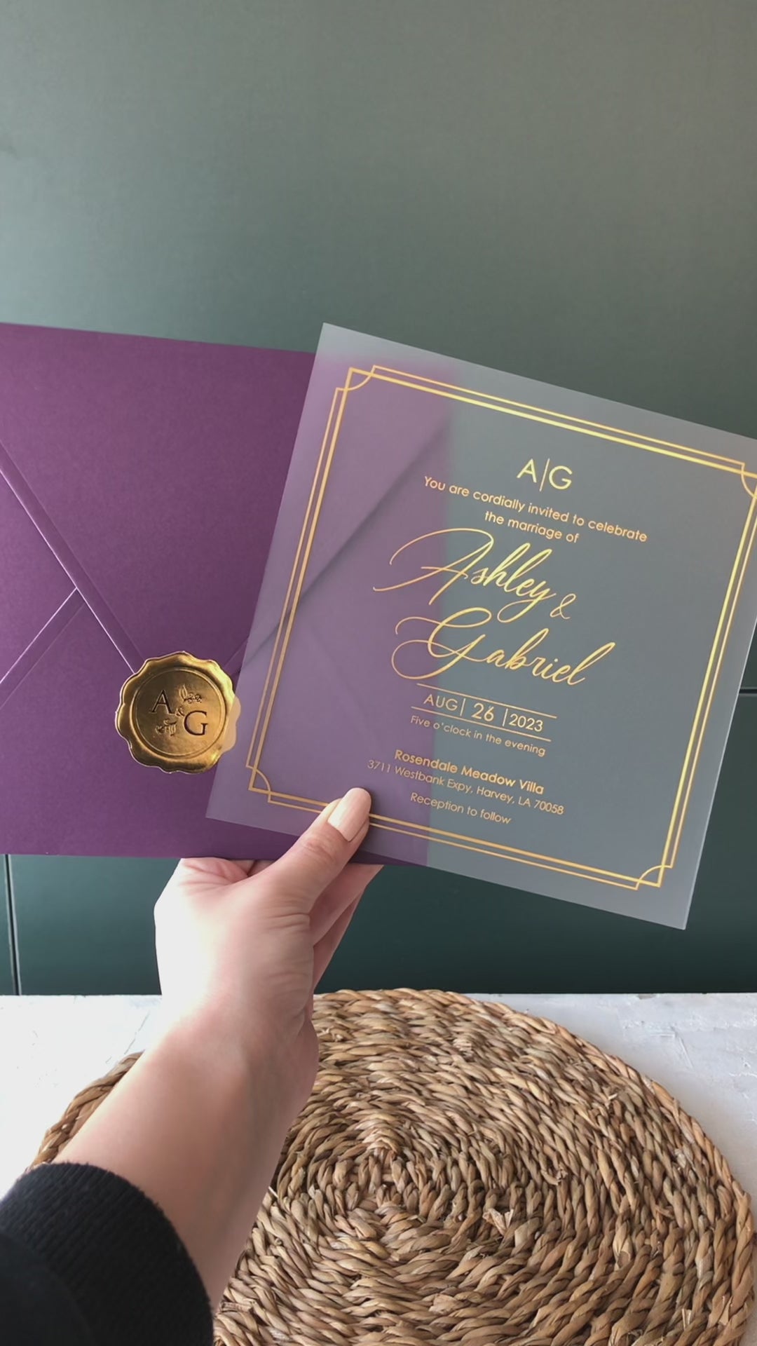 دعوات زفاف أكريليك مطلية بالذهب مع مظاريف أرجوانية