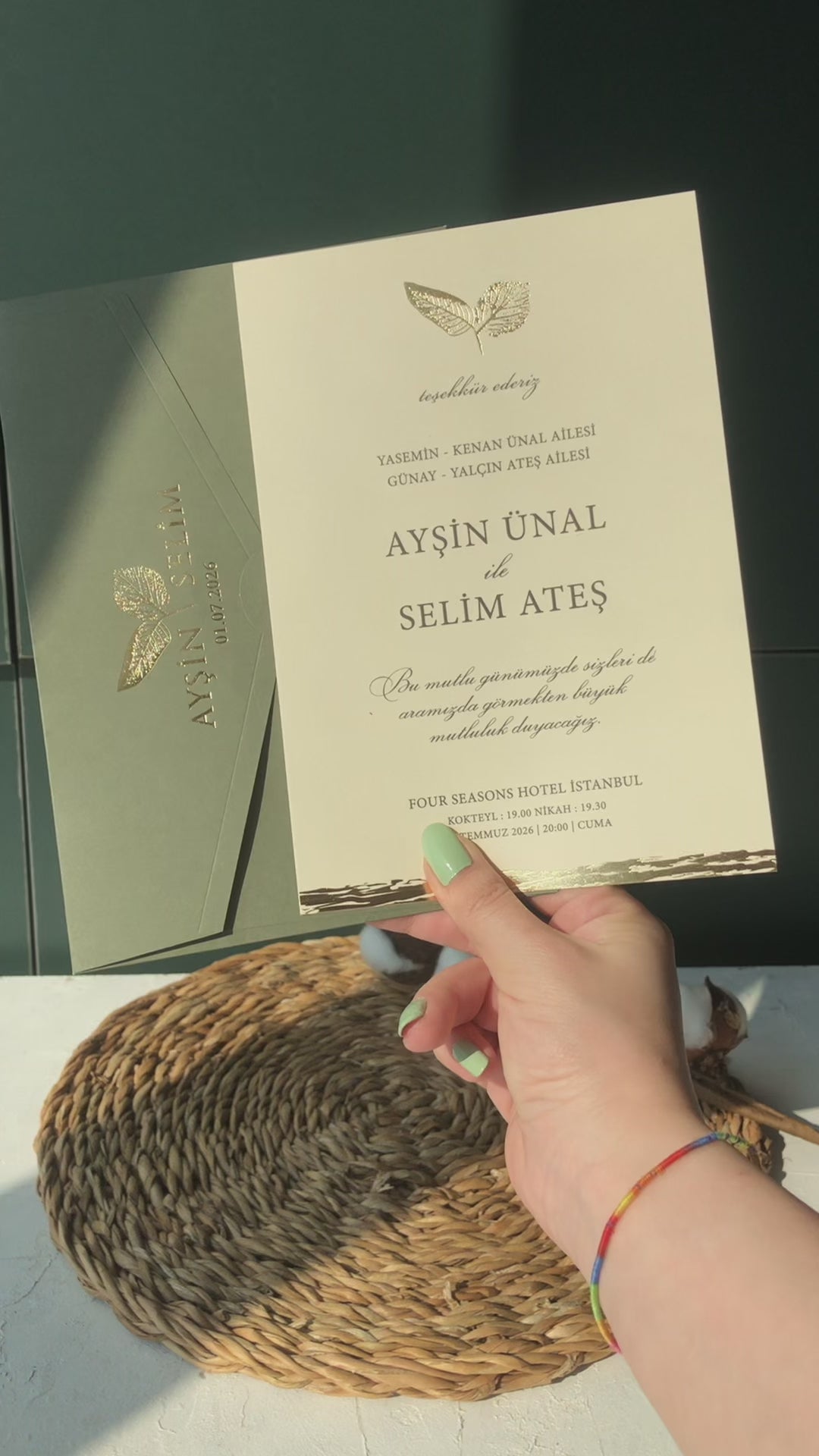 دعوة زفاف بسيطة مع مظروف أخضر كاكي مستوحى من الطبيعة