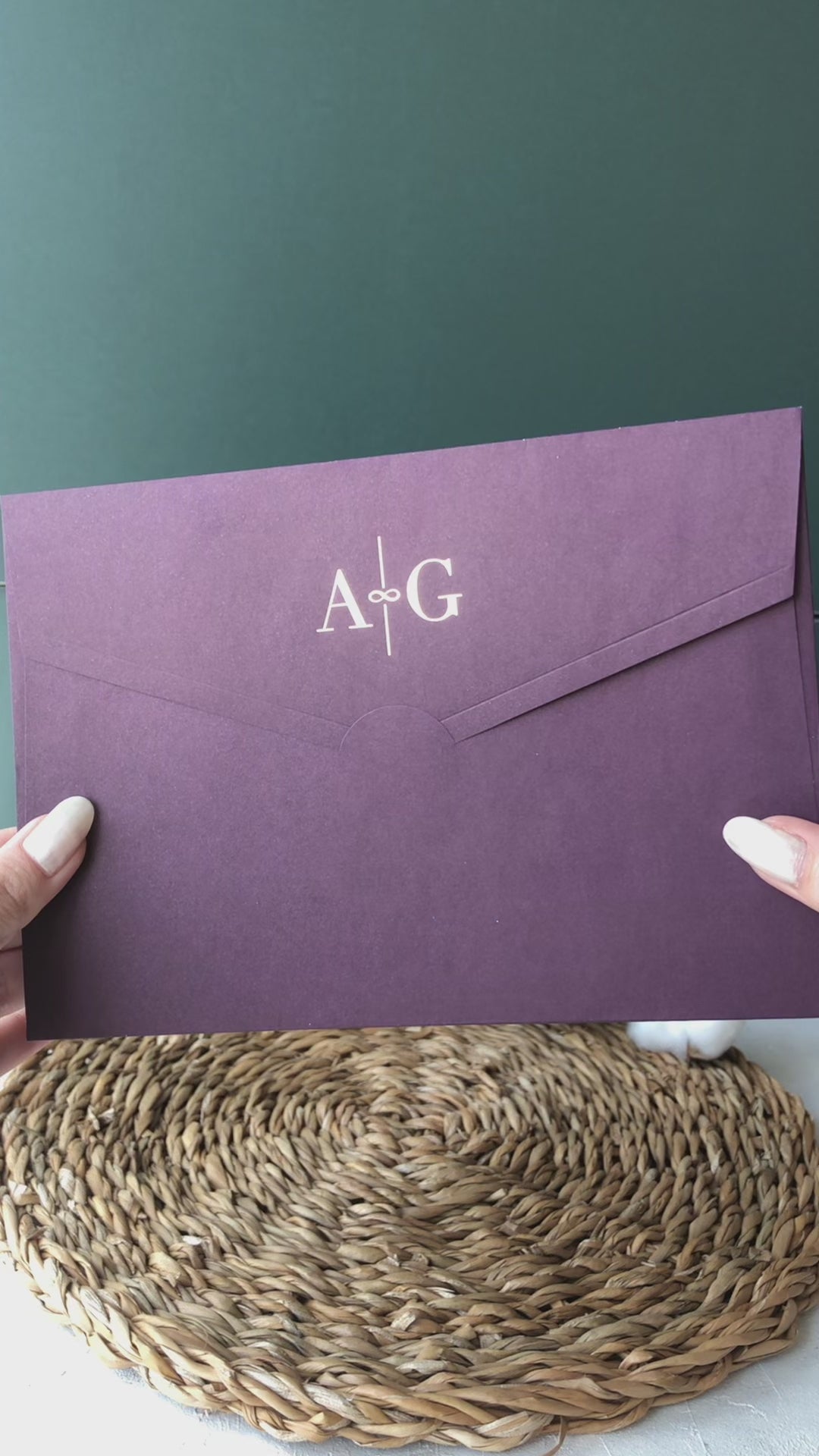 Acrylic Wedding Invitation with Purple Envelope | Gold Foil Printing Want your wedding invitations to make a statement? Order these stylish acrylic invitations with gold foil printing and a beautiful purple envelope. With these stunning acrylic invitations, your wedding will be sure to stand out. The elegant gold foil printing and vibrant purple envelope will make a memorable first impression.
