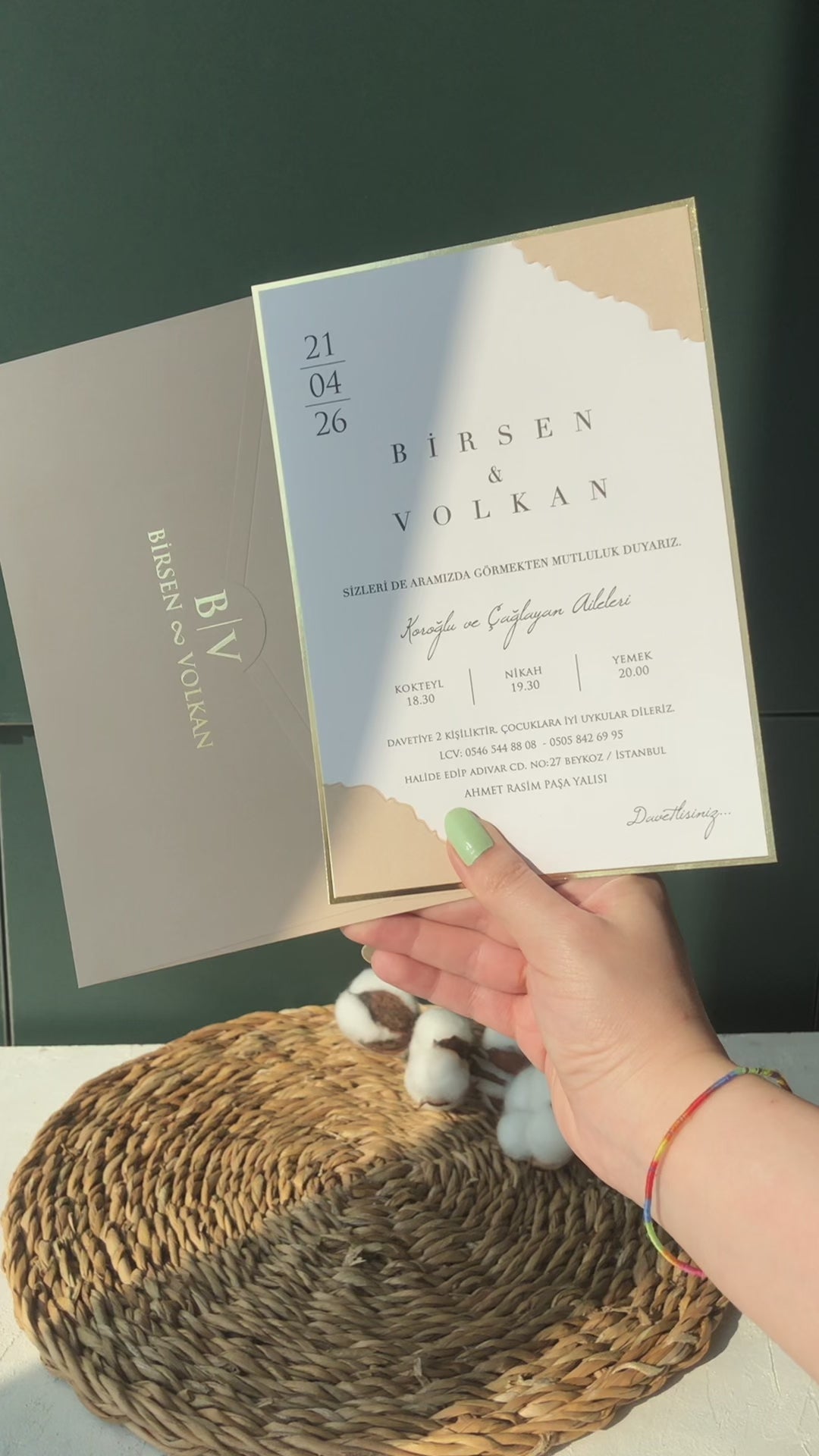 Beige Wedding Invitation, Gold Foil Frame, Beige Invitation and Envelope