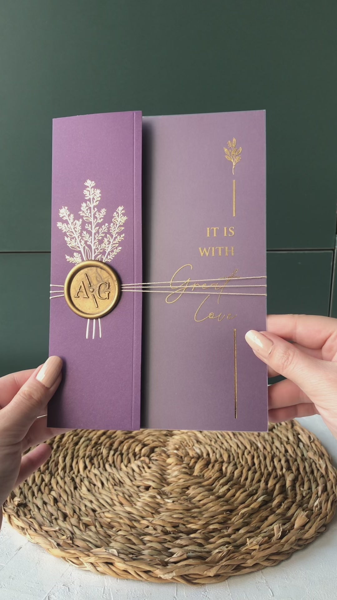 Indulge in the opulence of our gold foiled acrylic wedding invitations, beautifully complemented by Purple half jacket envelopes and exquisite wax seal accessory details. These invitations exude a sense of timeless sophistication, perfect for couples seeking a truly unforgettable way to invite their guests.