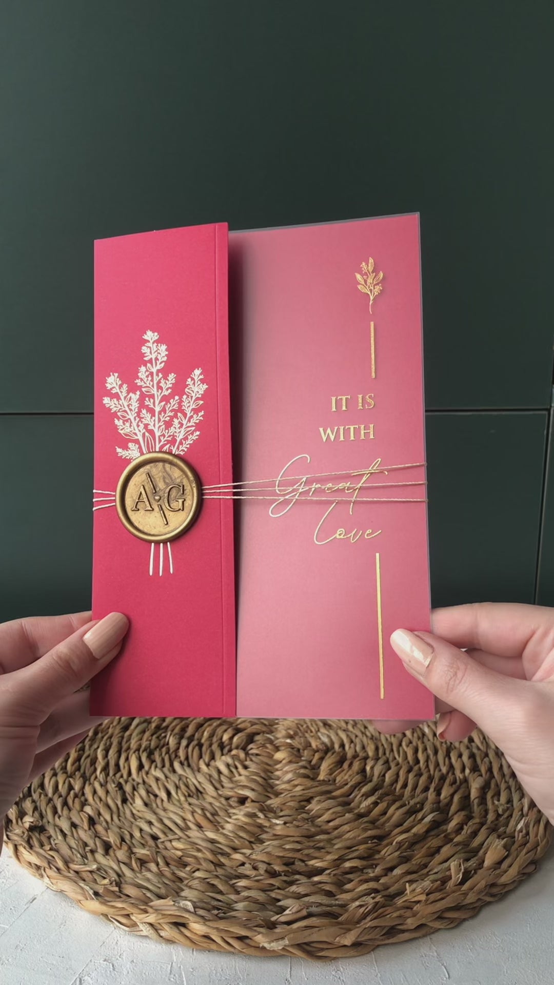 Indulge in the opulence of our gold foiled acrylic wedding invitations, beautifully complemented by Red half jacket envelopes and exquisite wax seal accessory details. These invitations exude a sense of timeless sophistication, perfect for couples seeking a truly unforgettable way to invite their guests.