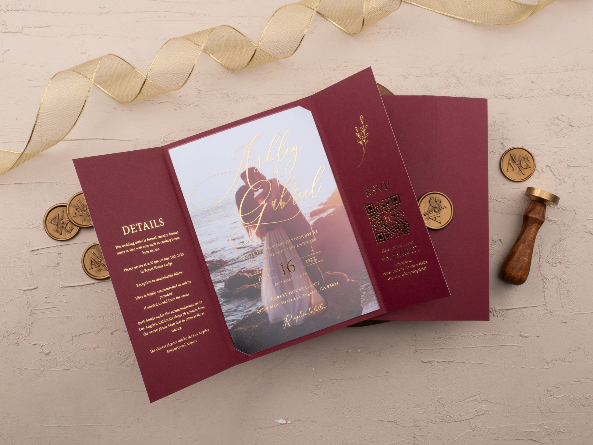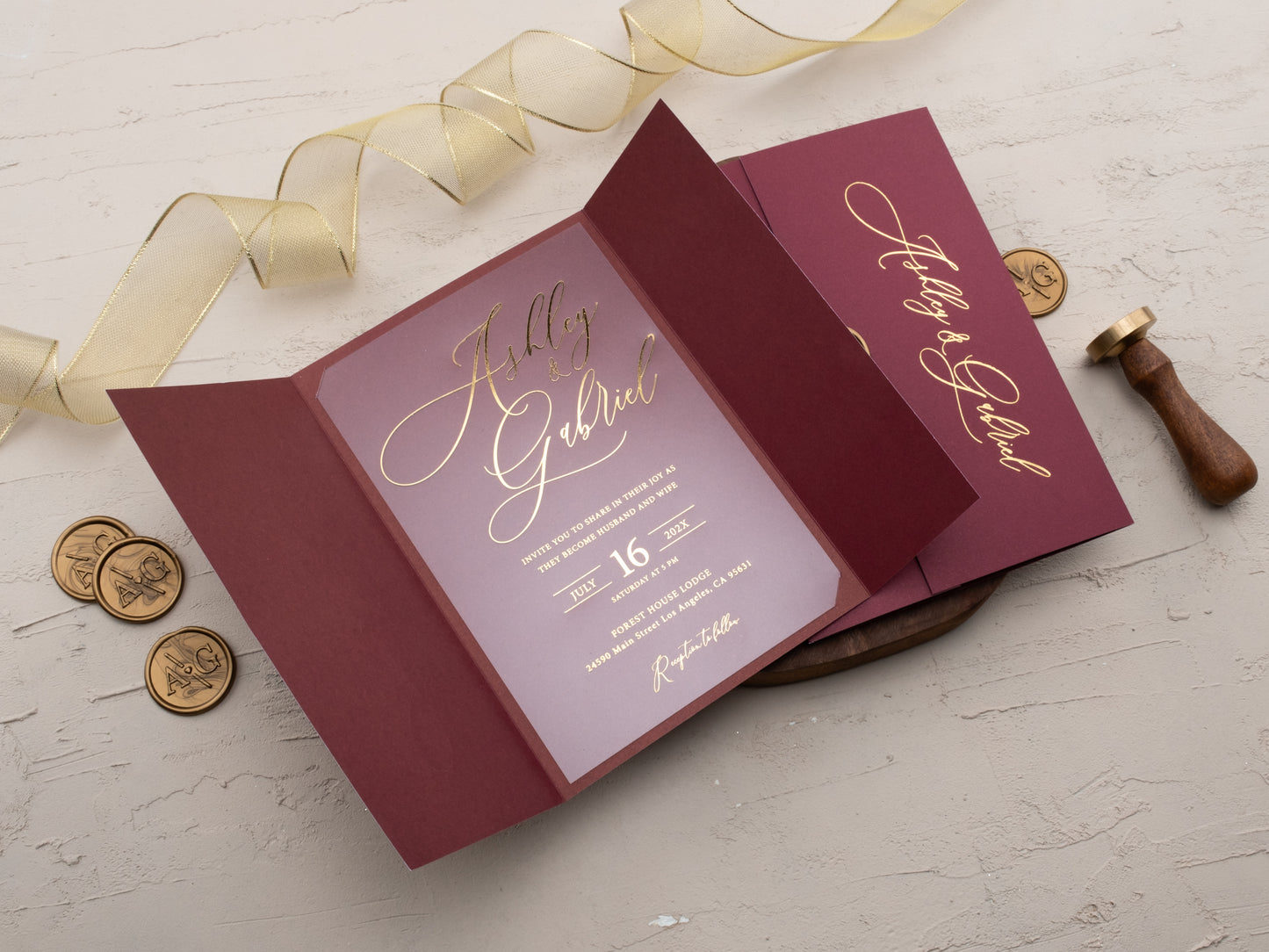 Make a lasting impression with this luxury burgundy and gold wedding invitation featuring a clear acrylic centerpiece. This tri-fold design combines rich burgundy cardstock with gold foil printing and a custom wax seal, offering a high-end look for elegant weddings.